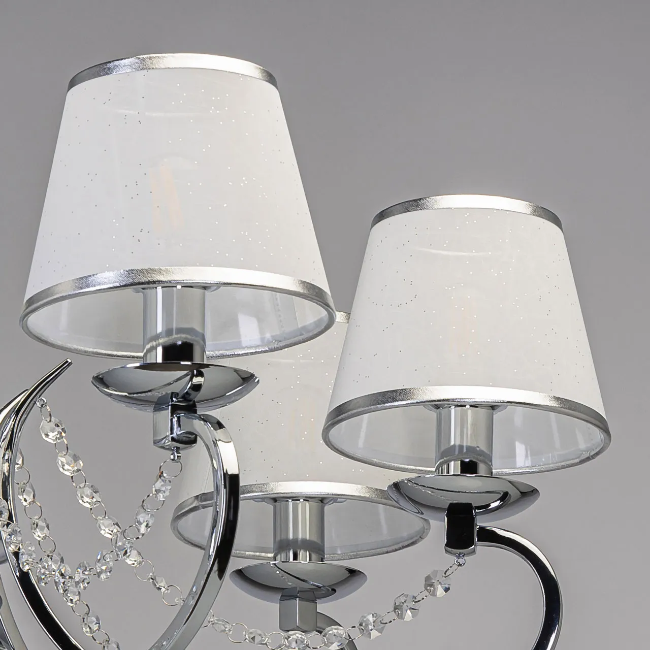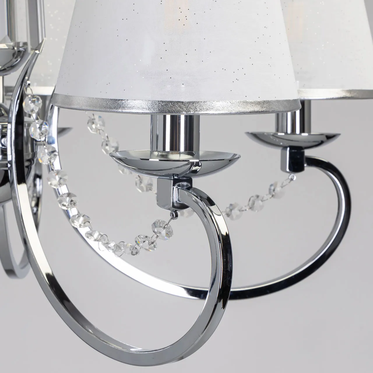 Основание/ металл/ хром Абажур/ текстиль, акрил/ белый, прозрачный Декор/ хрусталь/ прозрачный