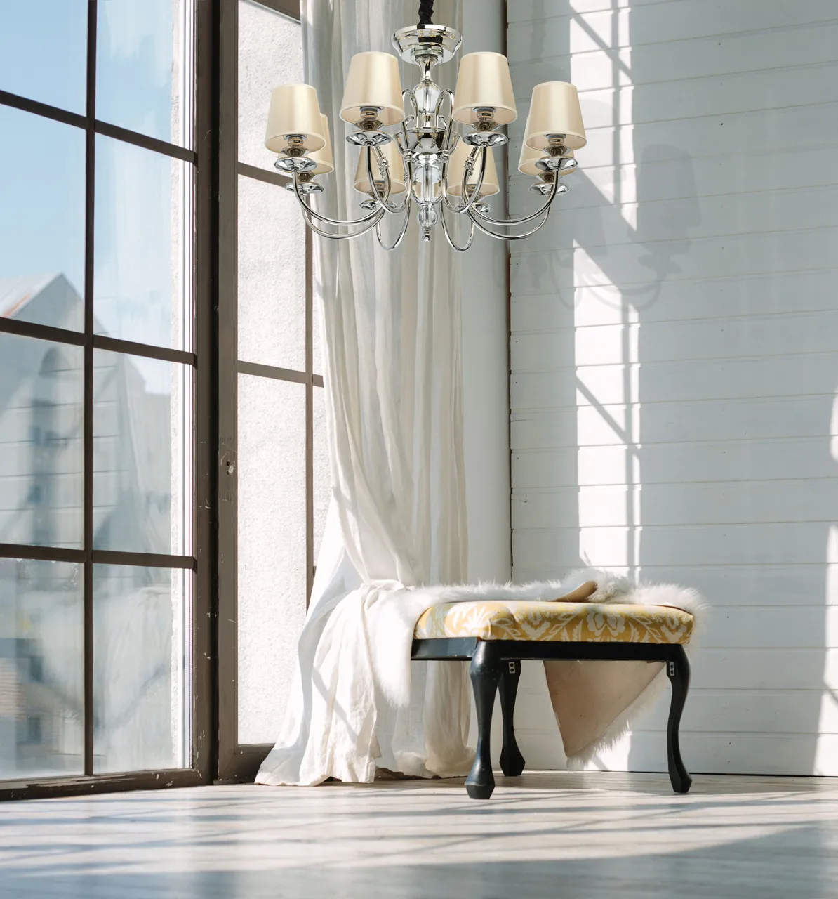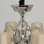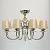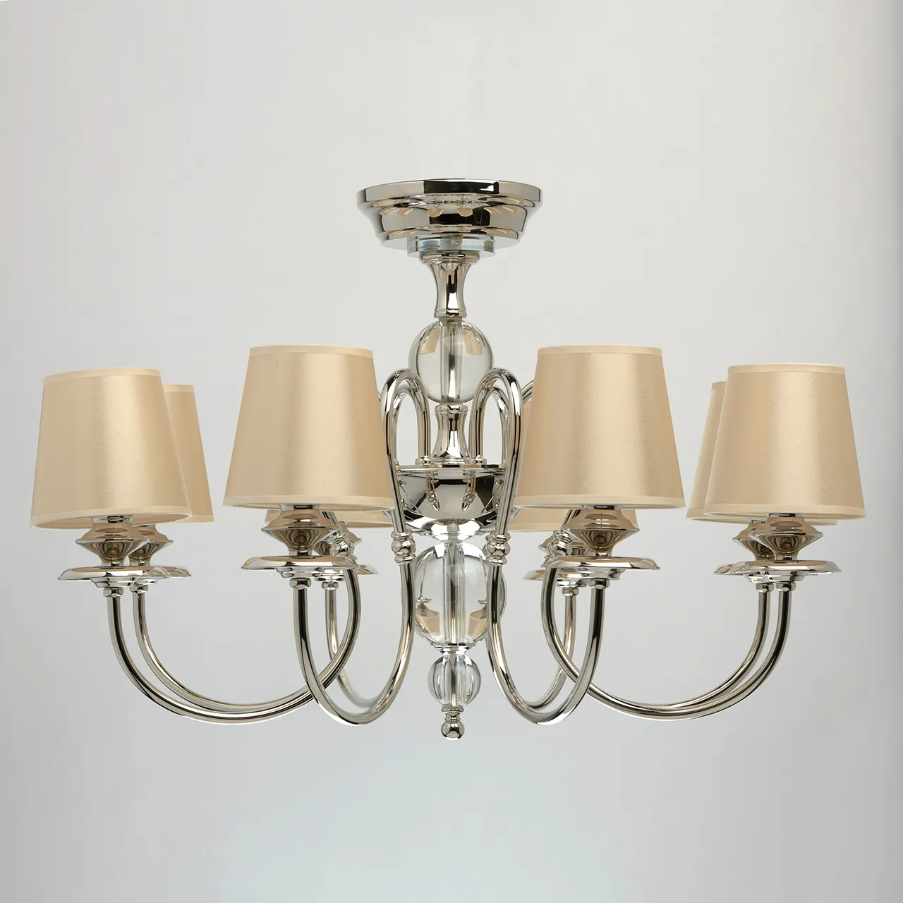 Металлическое основание цвета хрома. Декор: хрусталь. Текстильные абажуры бежевого цвета.