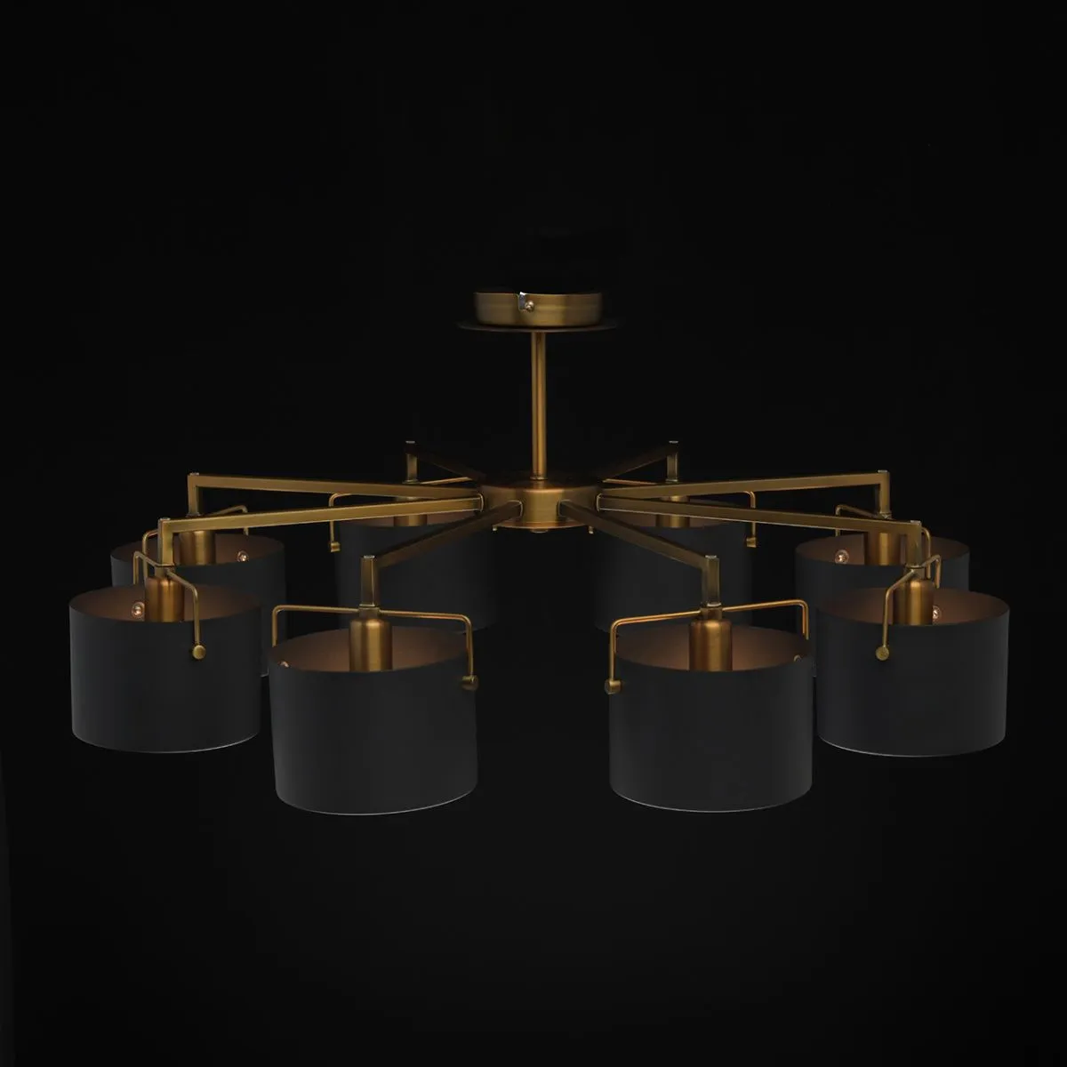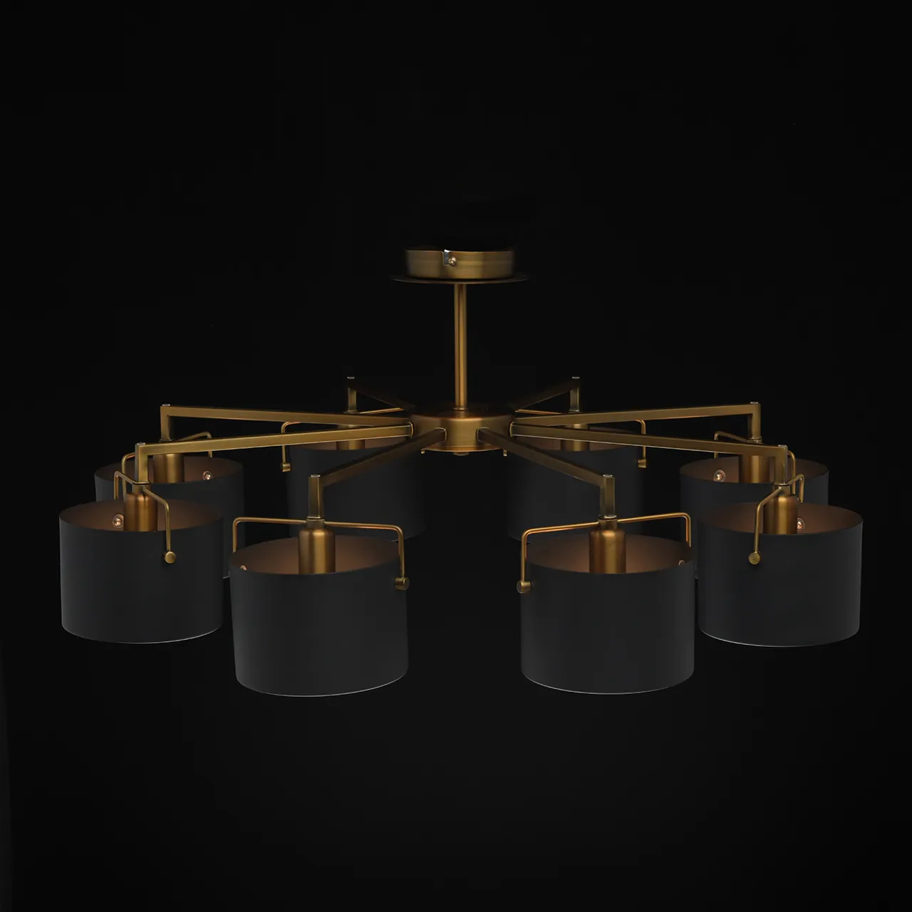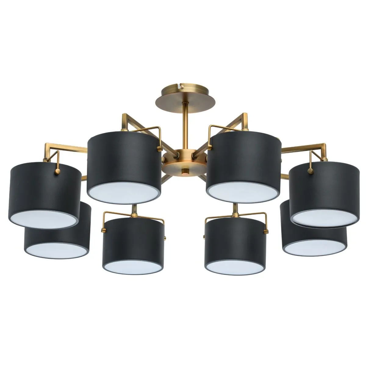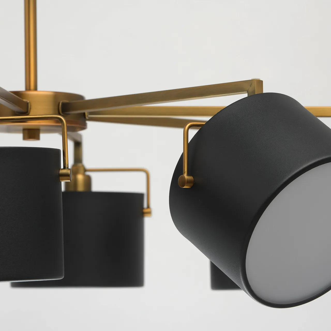 Металлическое основание цвета античной бронзы. Металлические плафоны черного цвета. Матовый акрил.